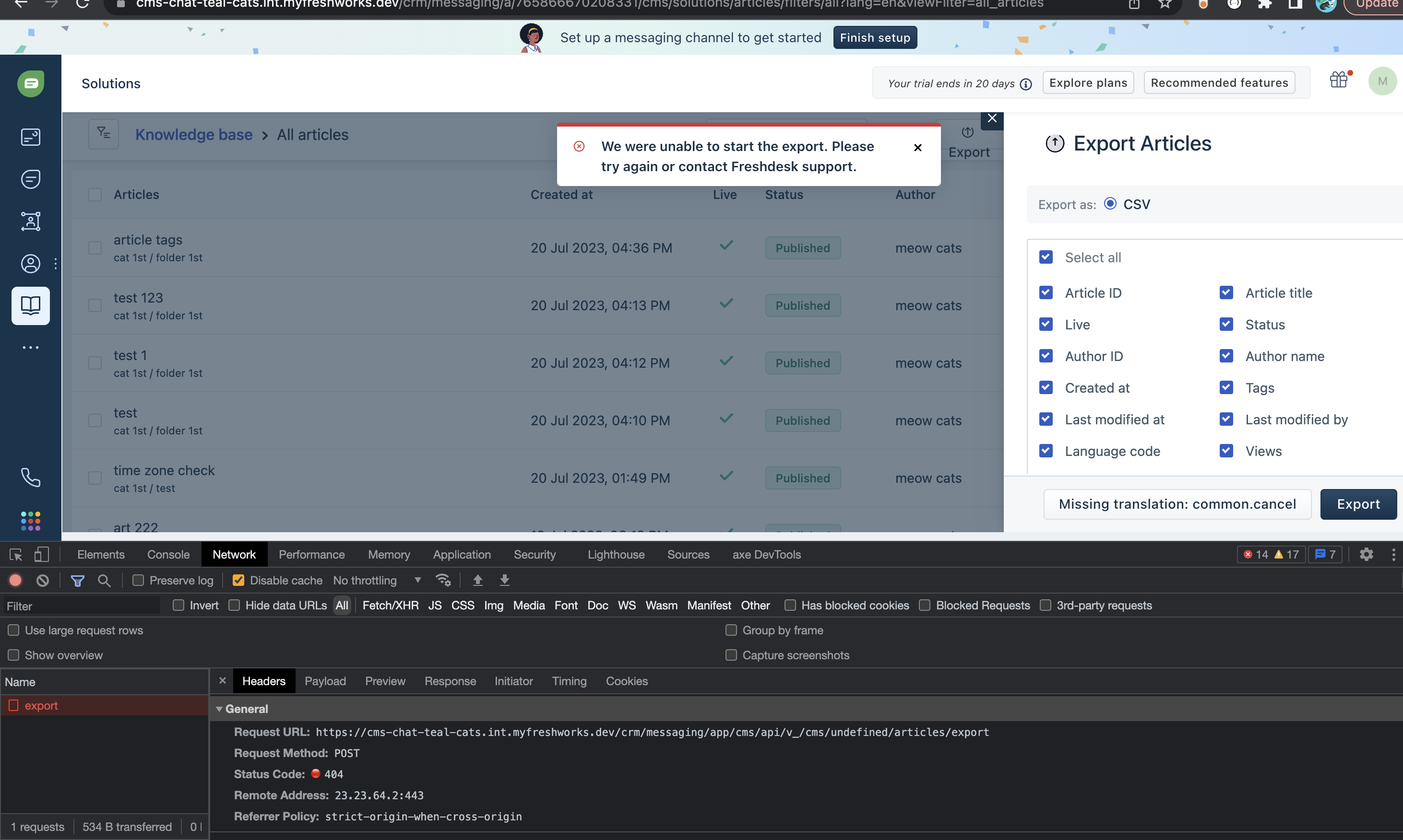 Getting the article export request URL from frontend as https://cms-chat-teal-break.int.myfreshworks.dev/crm/messaging/app/cms/api/v_/cms/undifined/articles/export should be https://cms-chat-teal-break.int.myfreshworks.dev/crm/messaging/app/cms/api/v_/cms/solutions/articles/export