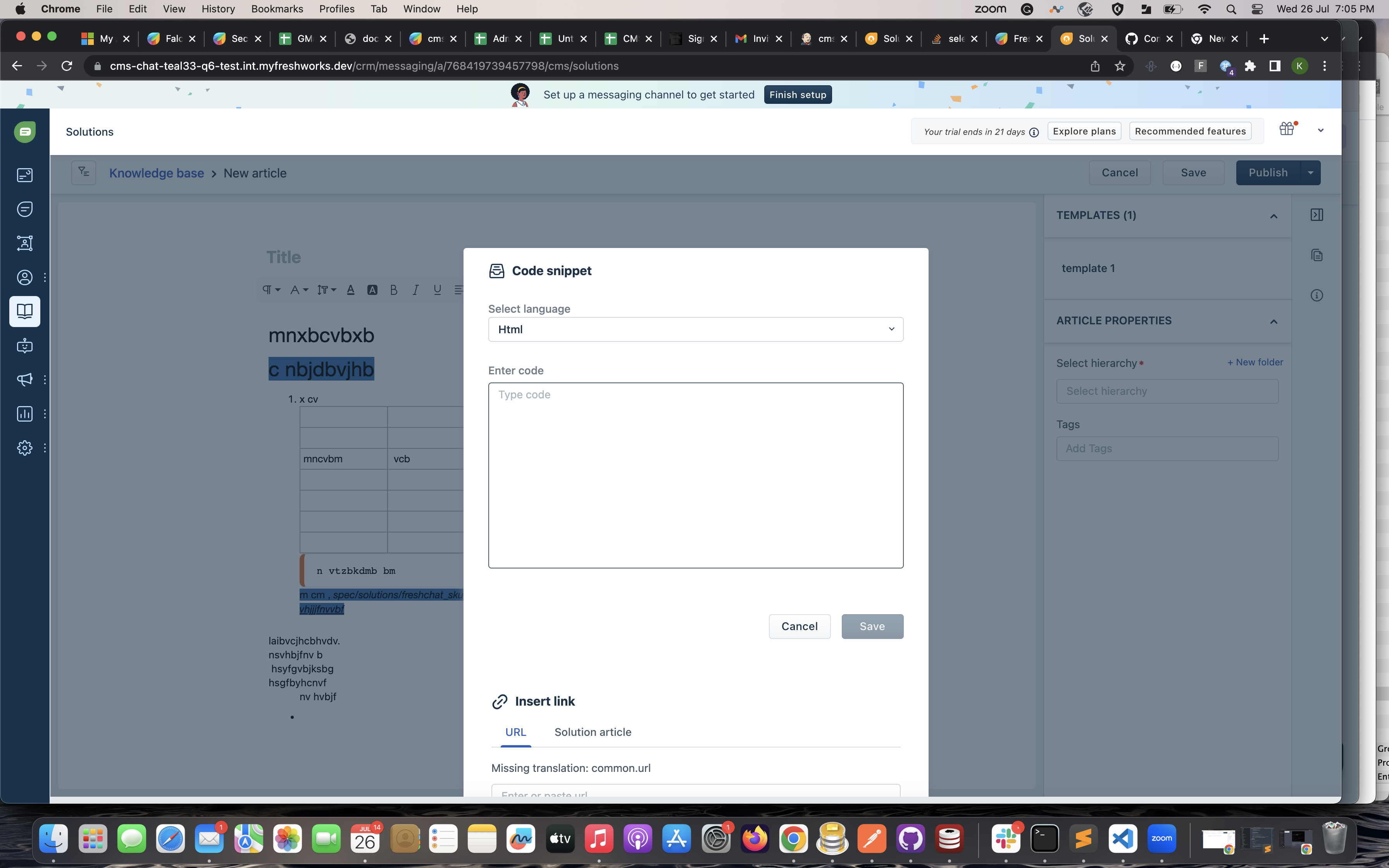 In new article page click insert code also open insert link