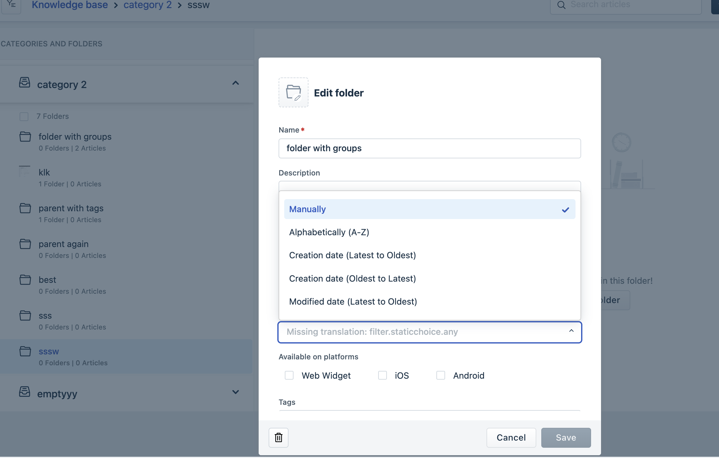Missing translation error in 'Order Articles' placeholder in folder modal